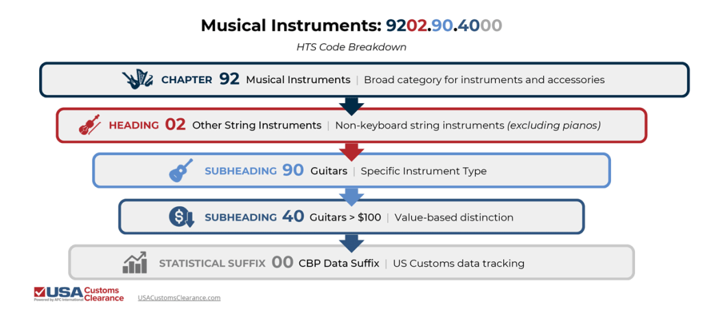 Knowing the anatomy of an HTS code can help you find the right ones for your imported goods. They can be broken down as follows: I’ll use the code for an electric guitar valued at over $100 as an example: 9202.90.4000.
