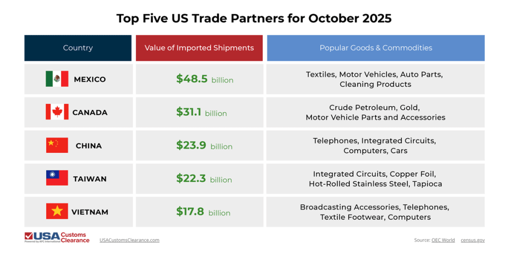 Some countries are better at producing certain types of commodities than others. For instance, China’s abundance of rare earths gives them an advantage in the manufacturing of electronics. To get an idea of where you should start looking, I’ve put together a list of the top US trade partners from October 2025, which is the most recent data available as of this writing.